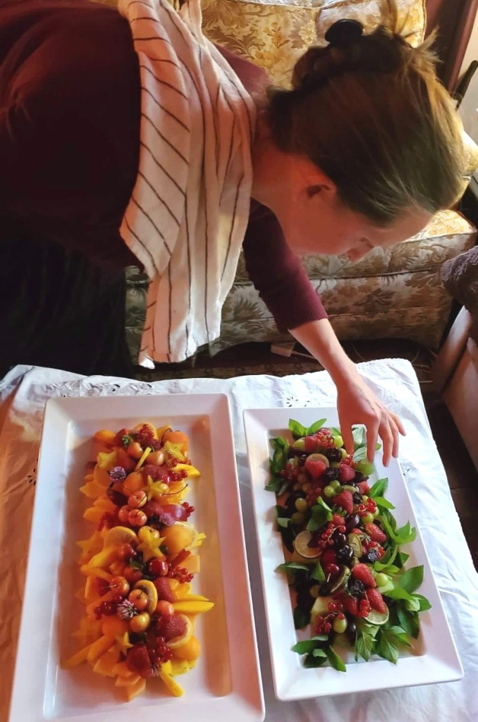 My personal meditation practice is often through food preparation. As previous owner and chef of Herbivore at the Door and Sweetgrass Catering, I continue to be in service through regular donations of fruit platters to a local women’s shelter (I have included a few pictures below for your enjoyment!)